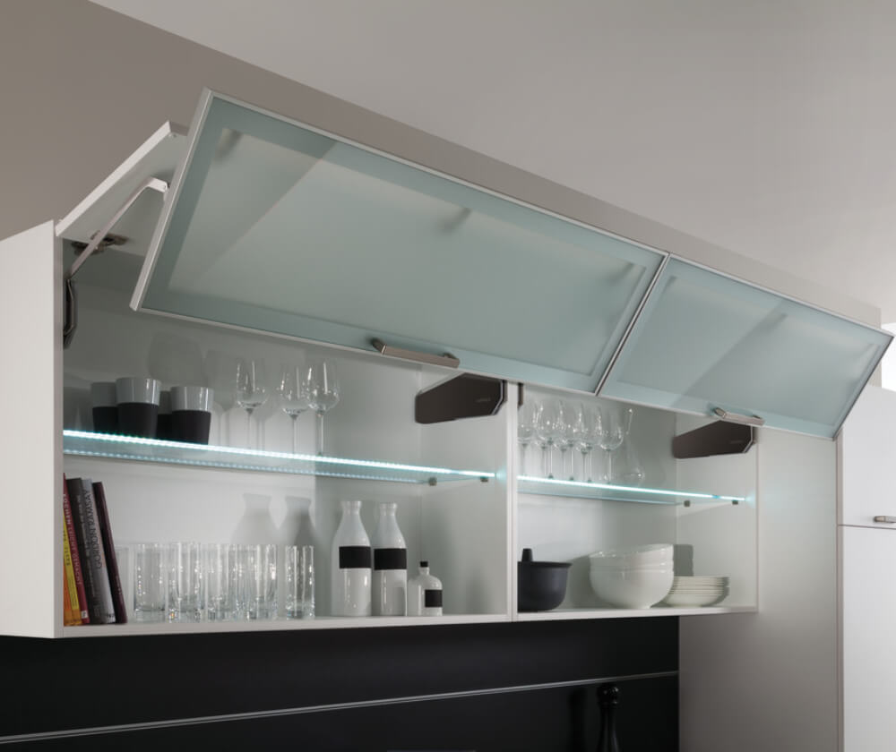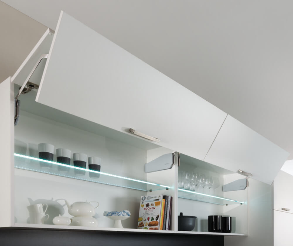Bestellhinweis: Topfscharniere für die Anbindung der Klappe an den Korpus, Mittelscharniere und ggf. Adapter für schmale Aluminiumrahmen müssen separat bestellt werden.<>br>