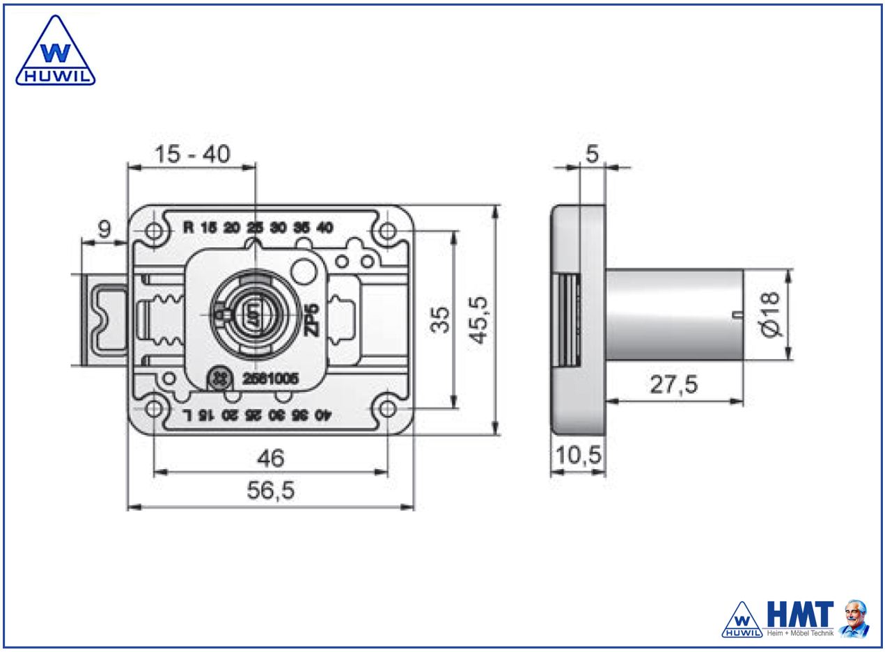 HUWIL Kastenschloss Typ 660 VCS18 Ø18mm [ZL27,5] - D15 bis D40 / rs + ls